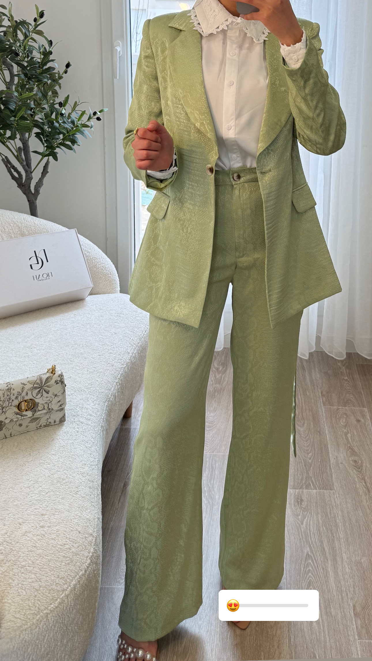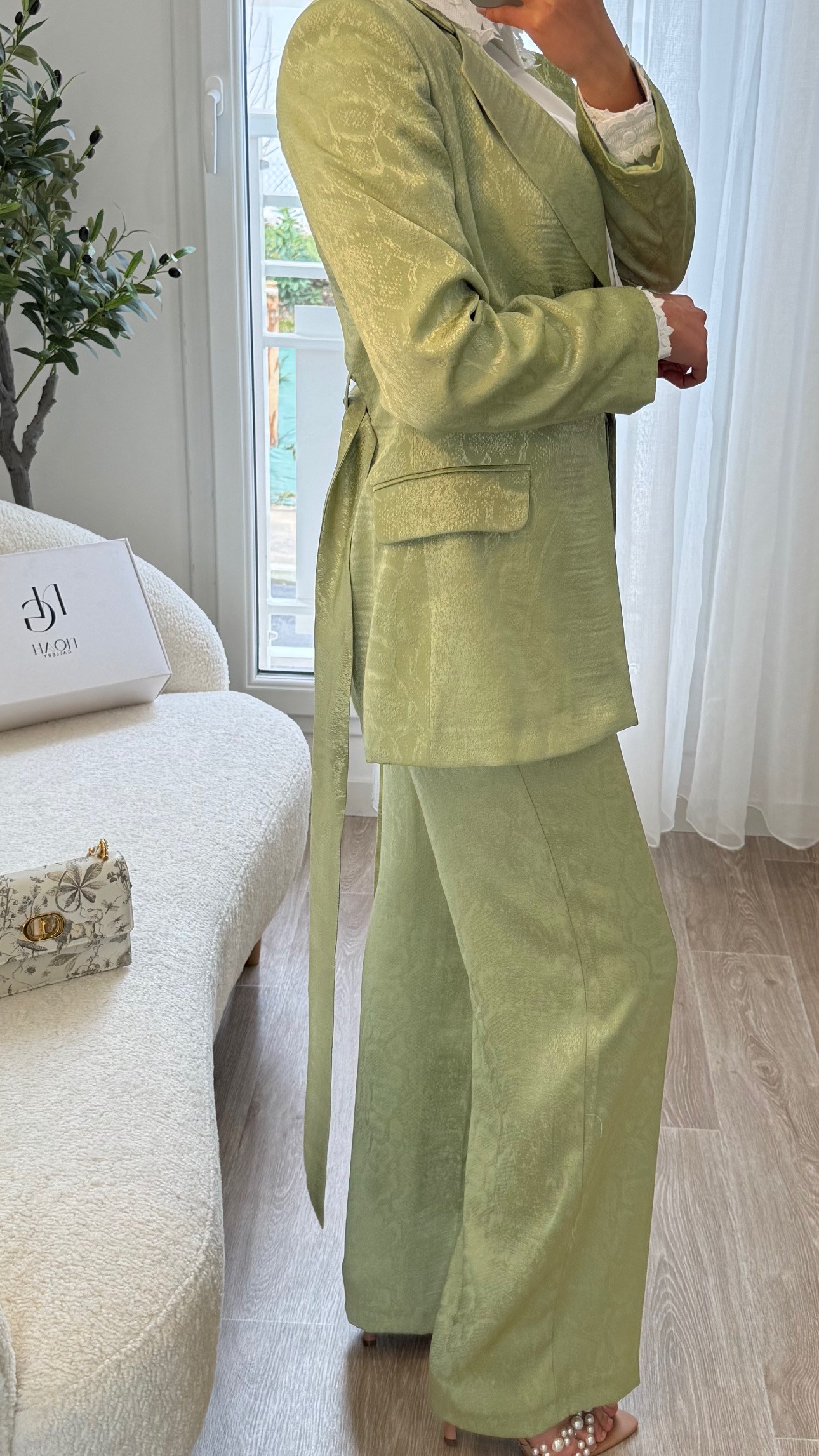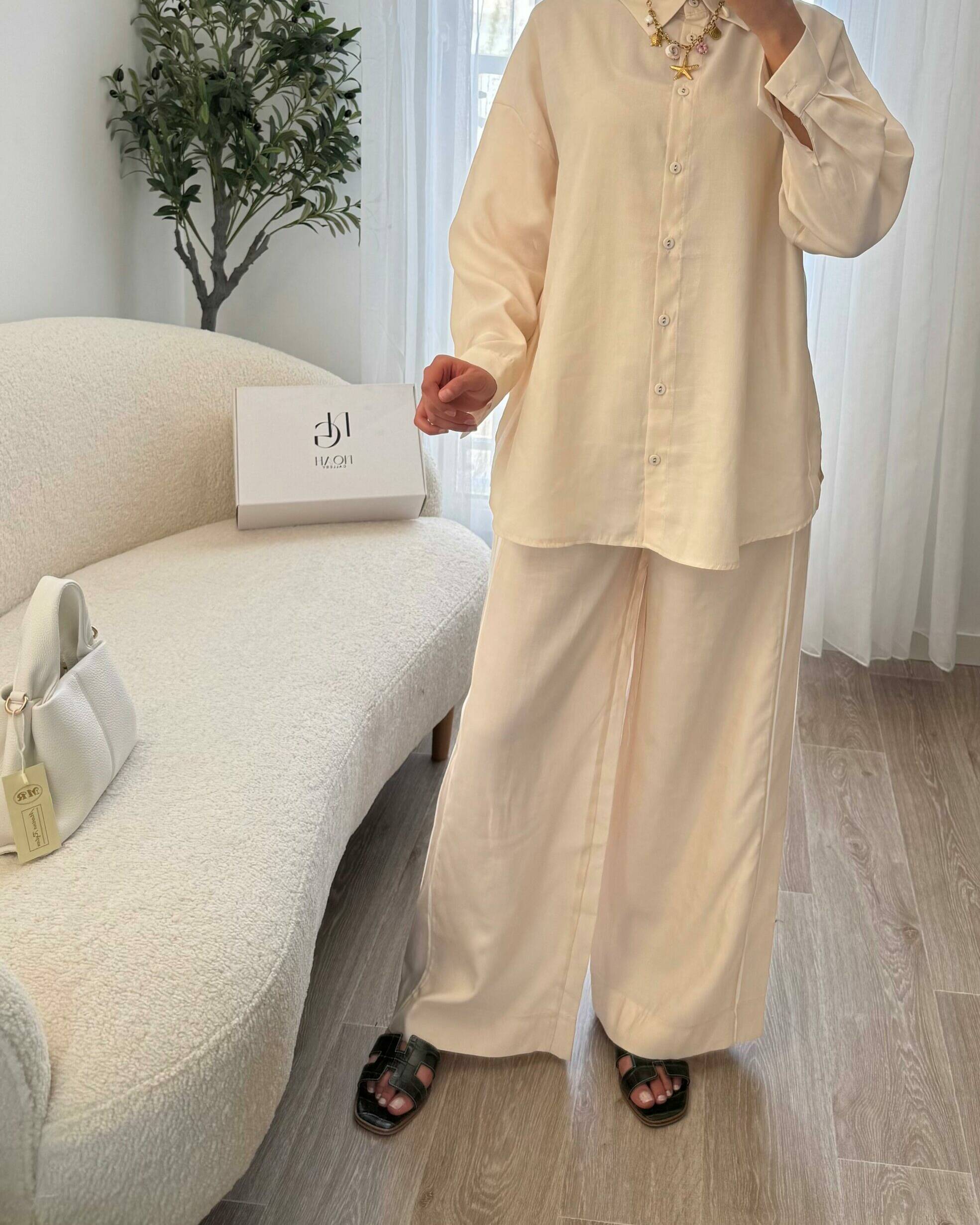 Un tailleur deux-pièces travaillé dans un tissu texturé, composé d’une veste structurée et d’un pantalon fluide. La coupe sobre et distinguée sublime chaque silhouette avec charme et élégance.
