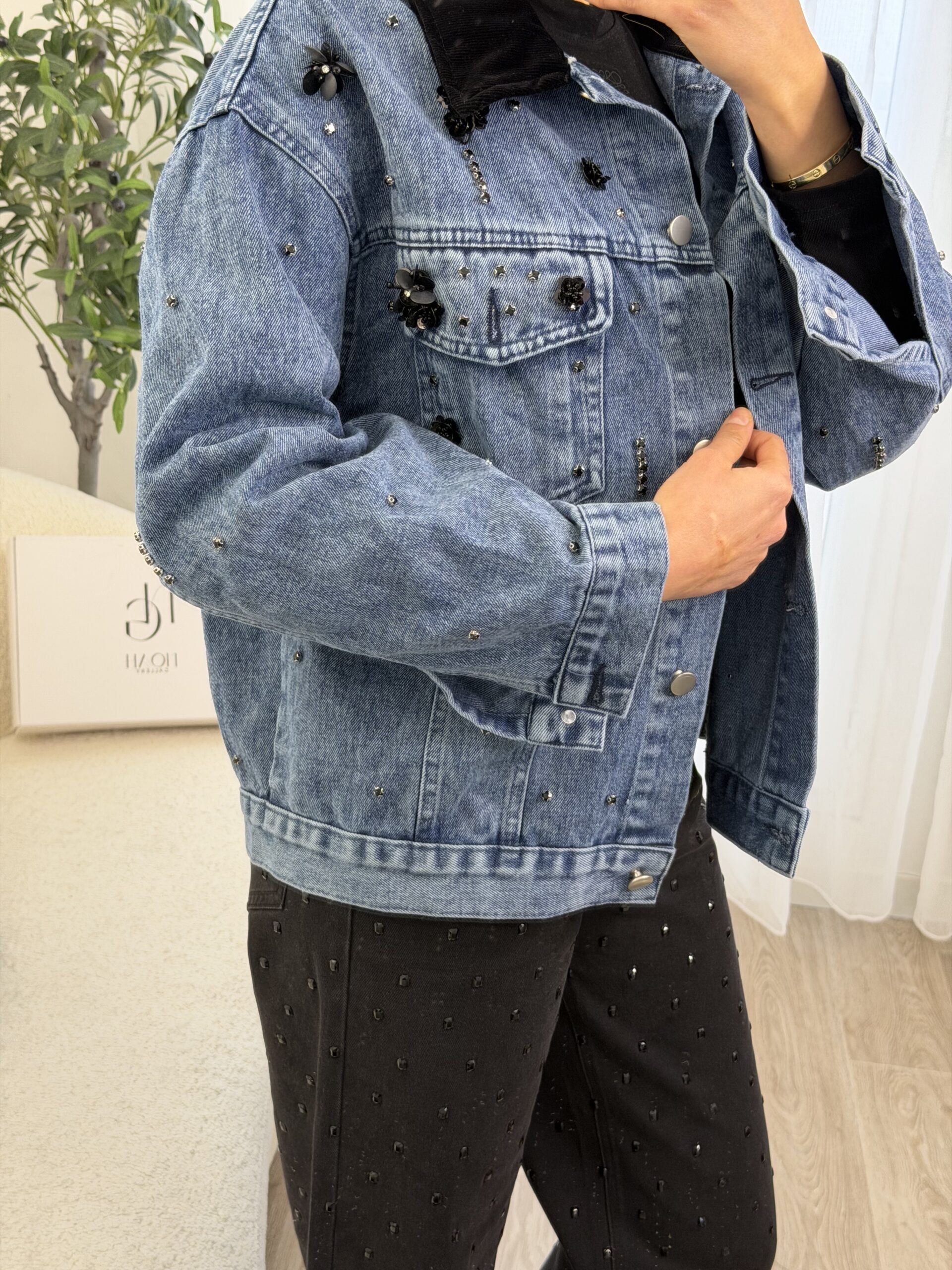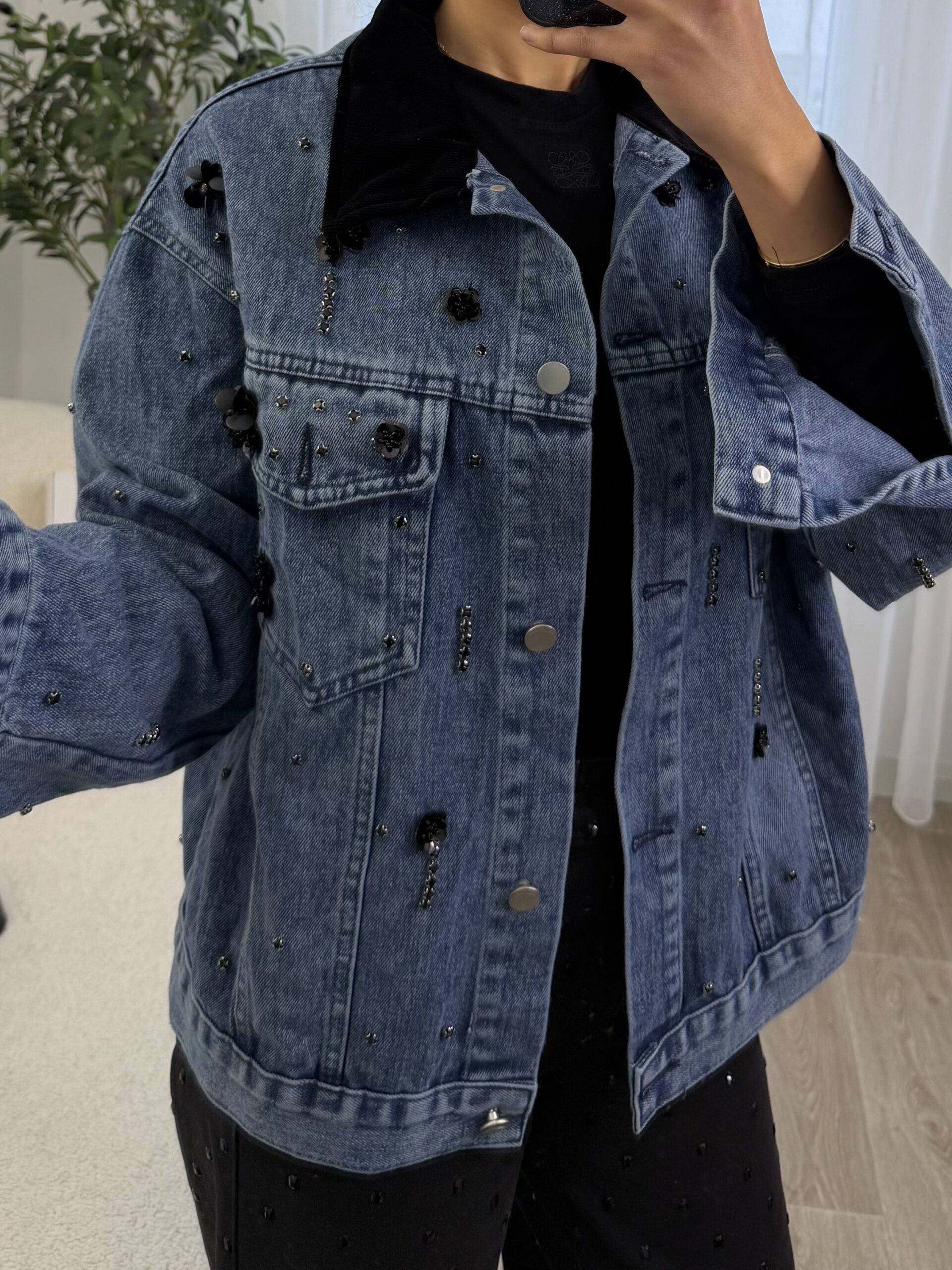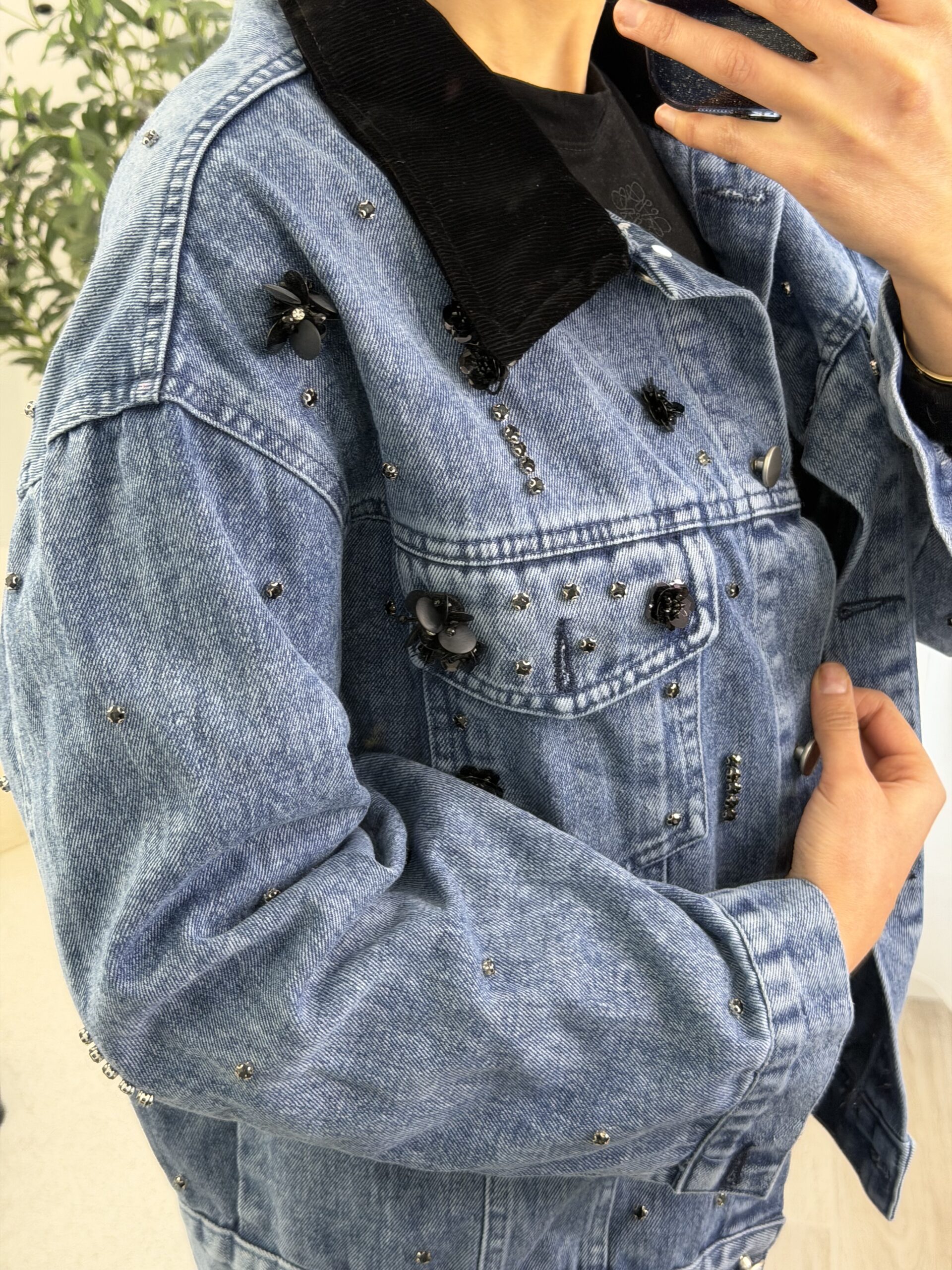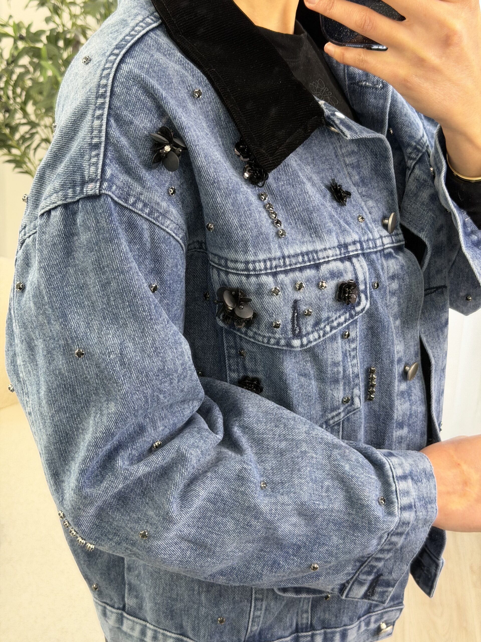 Veste en jean bleu revisitée avec des détails bijoux, mêlant strass et petites fleurs noires pour une touche chic et moderne. Sa coupe confortable en fait une pièce facile à porter, idéale pour donner du caractère à une tenue simple.