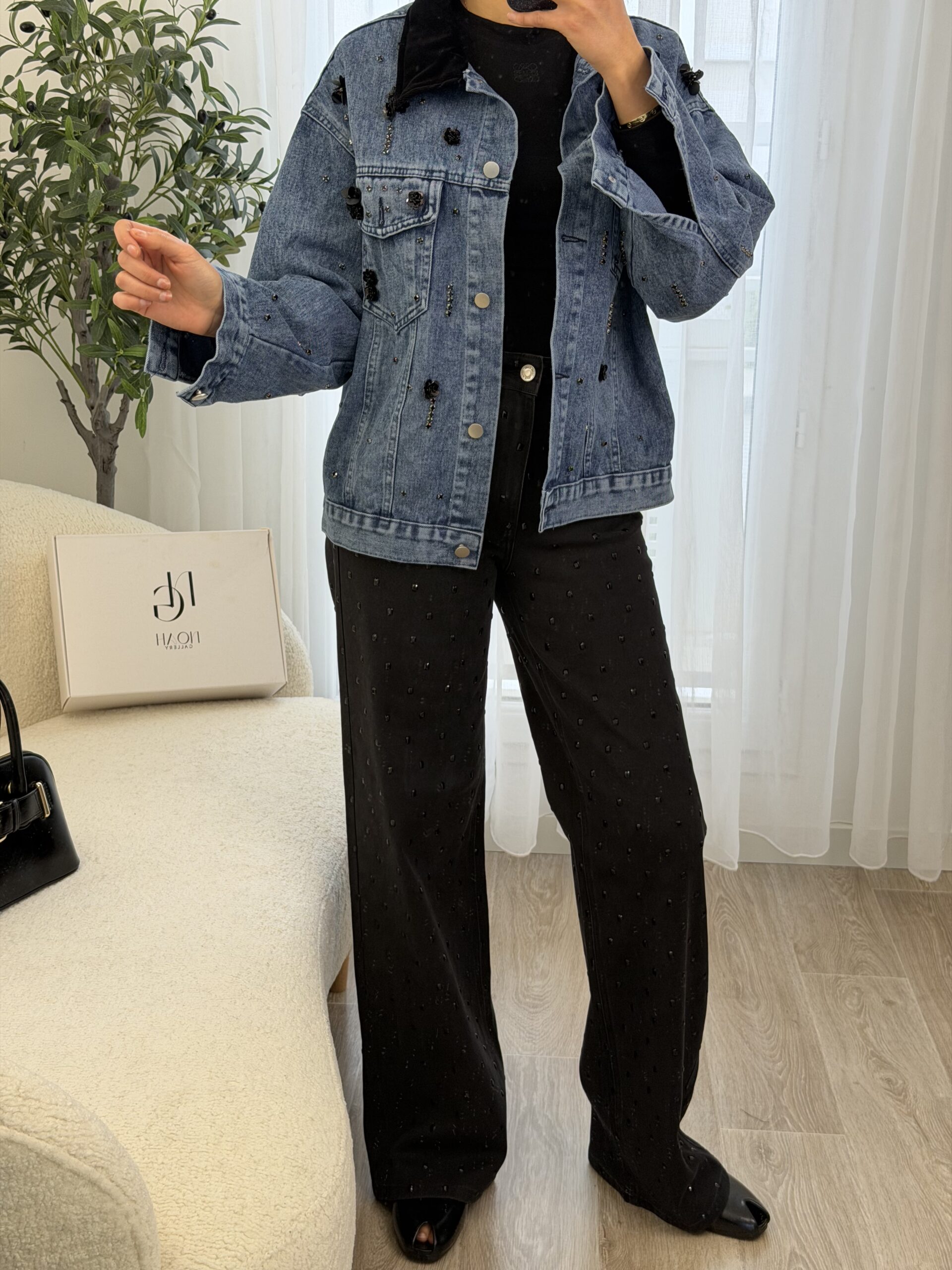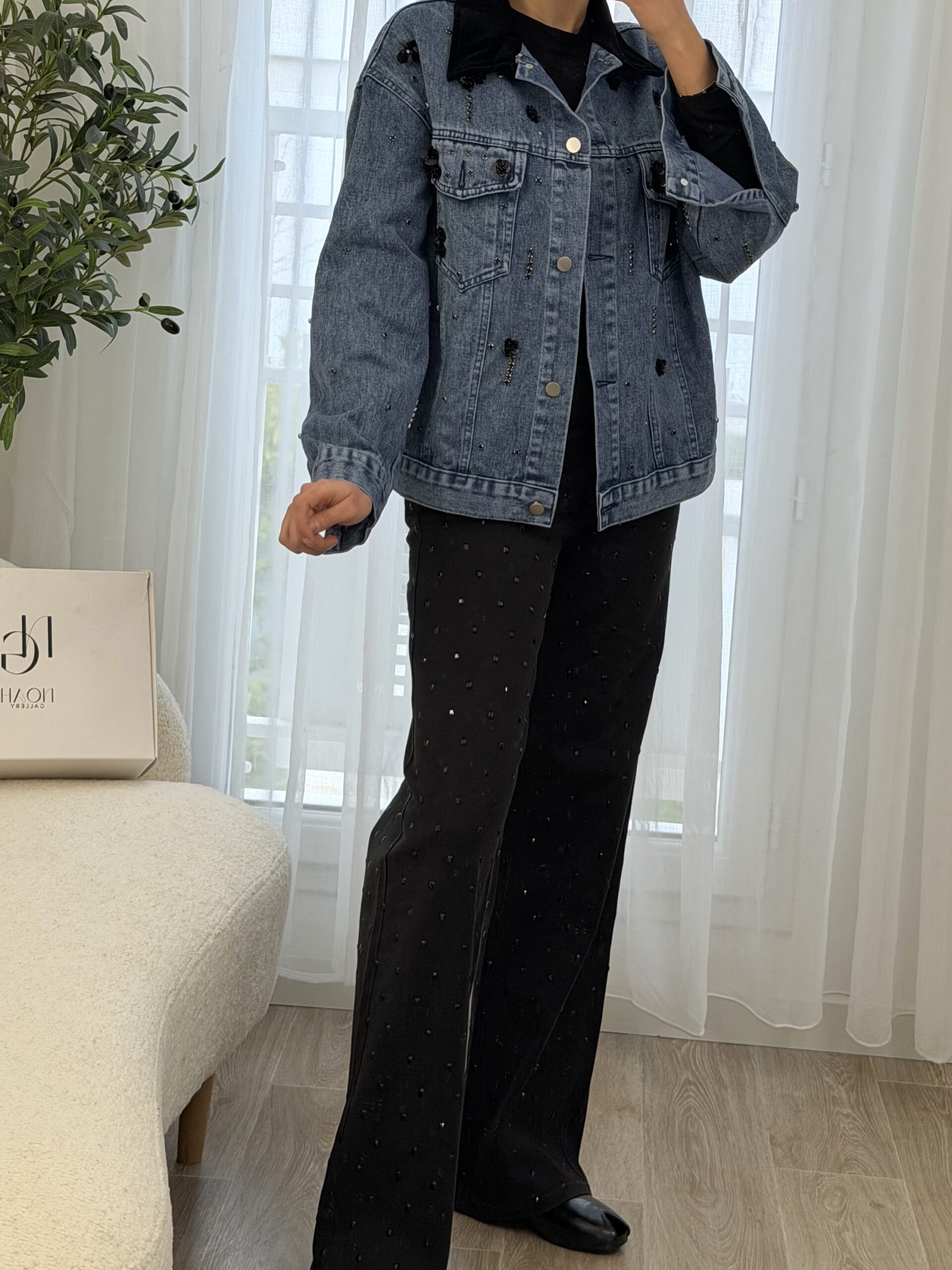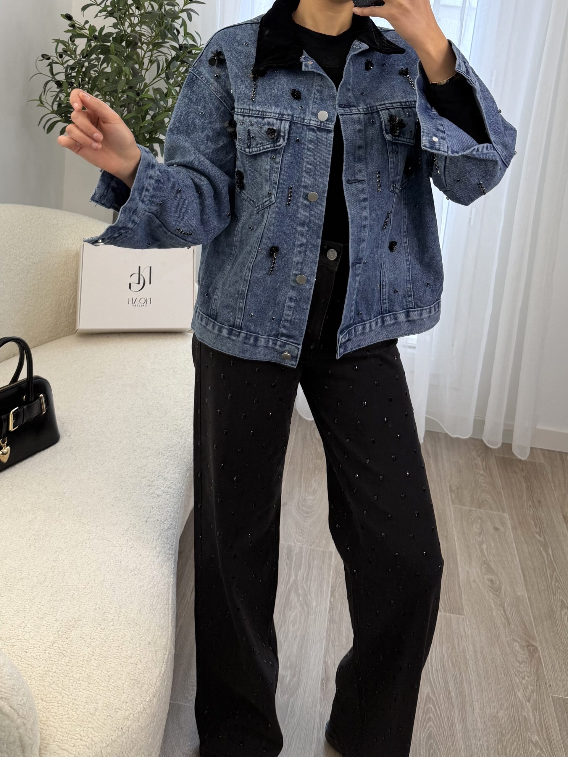 Veste en jean bleu revisitée avec des détails bijoux, mêlant strass et petites fleurs noires pour une touche chic et moderne. Sa coupe confortable en fait une pièce facile à porter, idéale pour donner du caractère à une tenue simple.