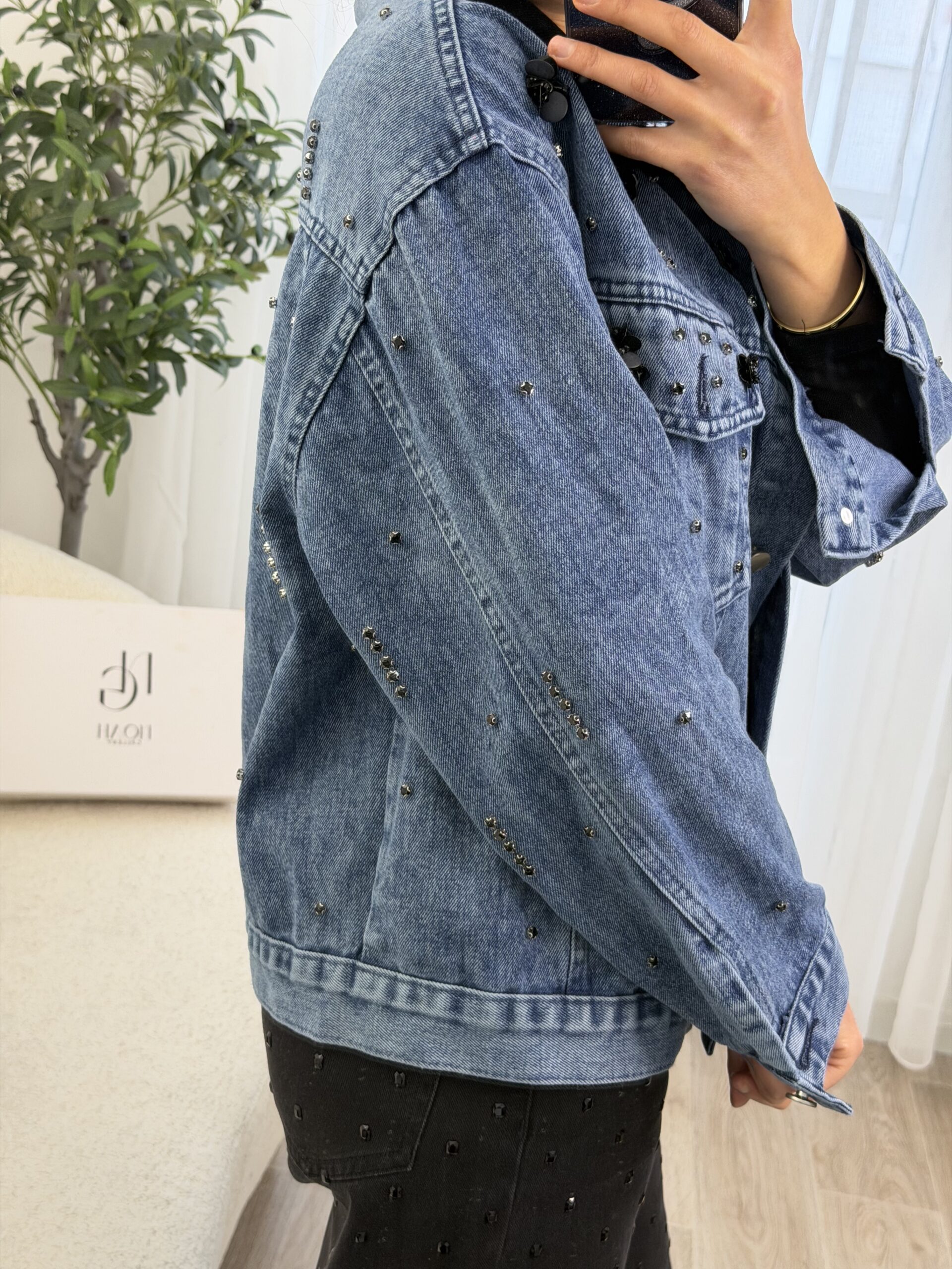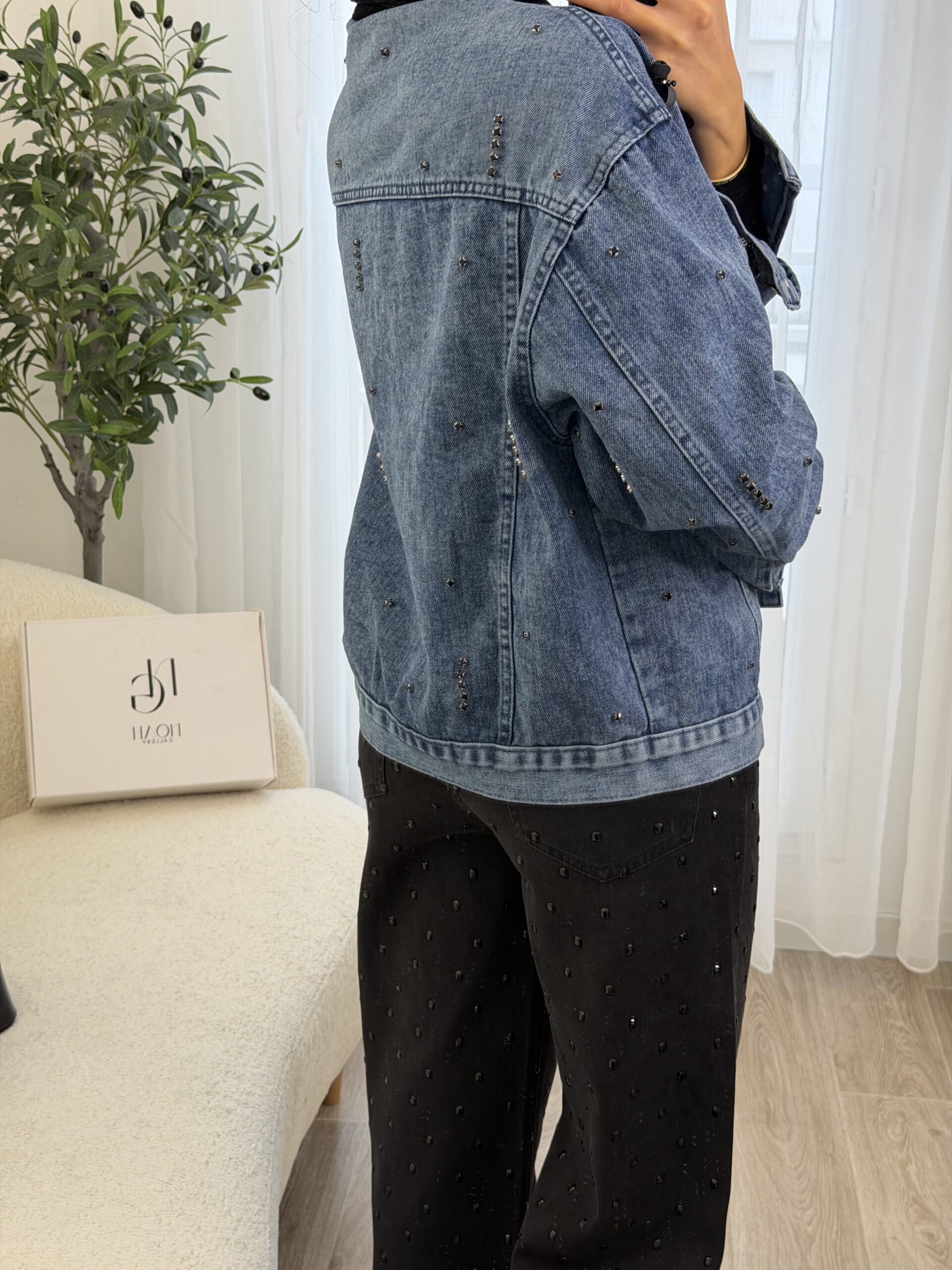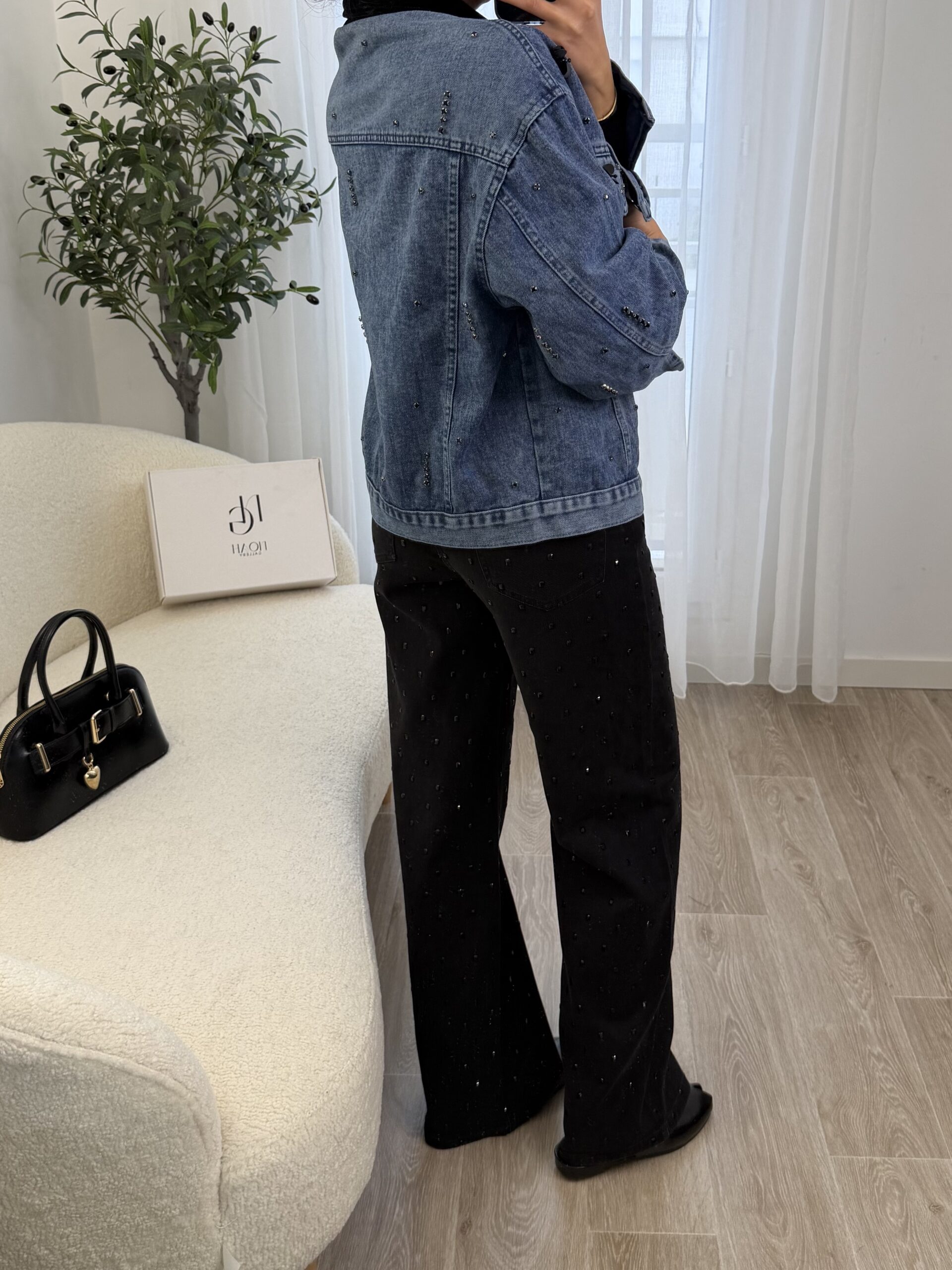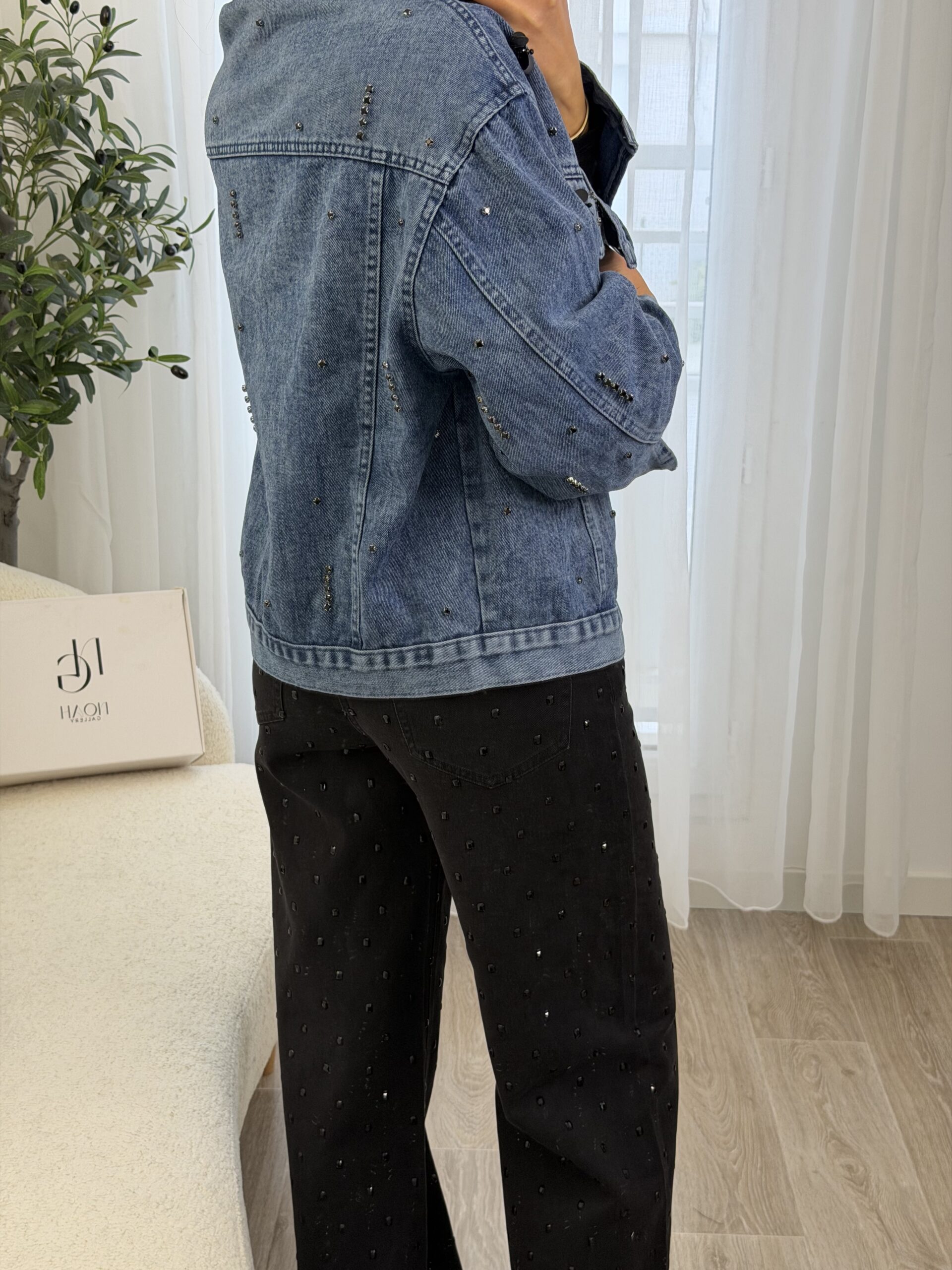 Veste en jean bleu revisitée avec des détails bijoux, mêlant strass et petites fleurs noires pour une touche chic et moderne. Sa coupe confortable en fait une pièce facile à porter, idéale pour donner du caractère à une tenue simple.
